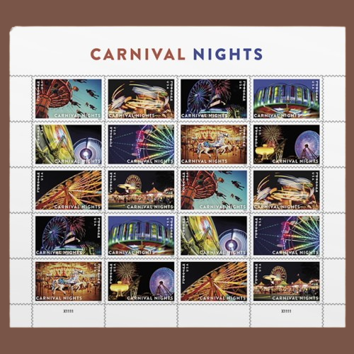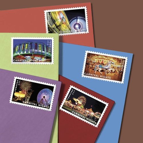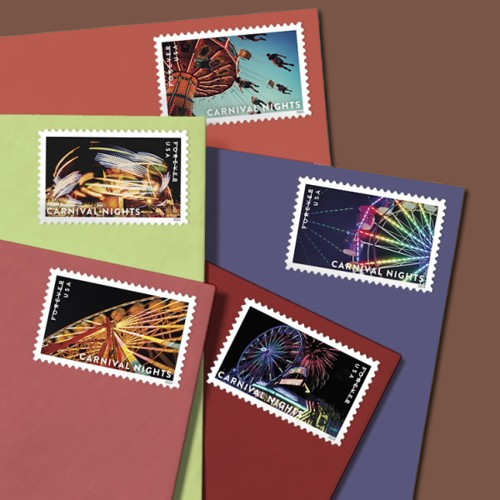 Carnival Nights Postage Stamps Forever are not just aesthetically striking but are also practical and long-lasting. As Forever stamps, they maintain their value and can be used to mail standard one-ounce letters at today’s rate, regardless of potential future rate increases.